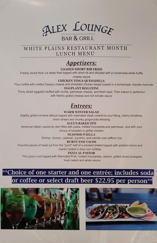 Welcome to Alex Lounge Bar & Grill, a vibrant gem nestled in the heart of White Plains, NY. This lively establishment, located at 213 E Post Rd, serves up a delightful fusion of flavors rooted in authentic Mexican cuisine. With a relaxed and casual ambiance, Alex Lounge offers both locals and visitors an inviting space to enjoy delicious food, refreshing drinks, and lively entertainment.